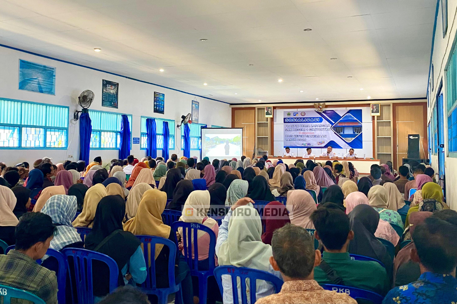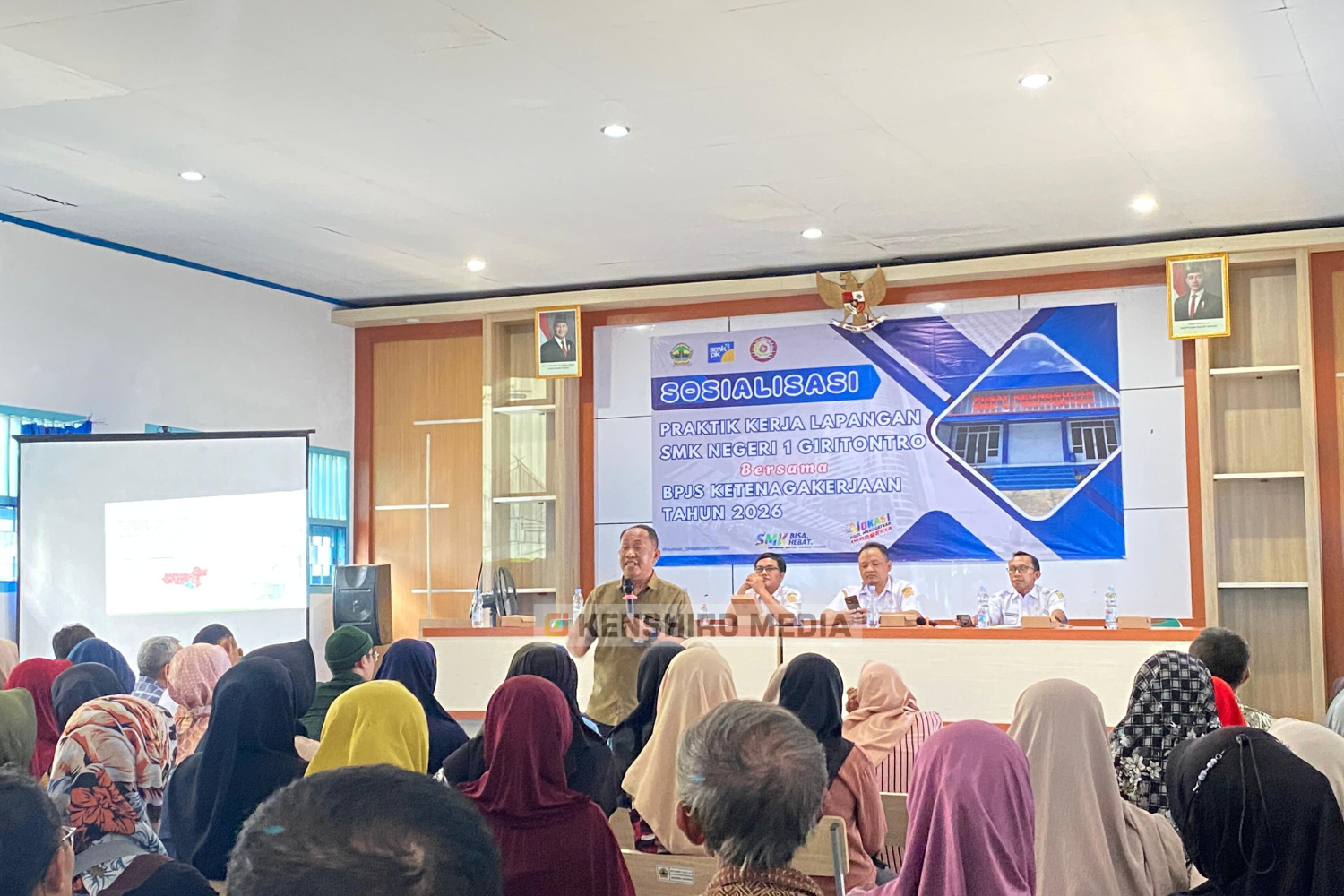 Rabu, 7 Januari 2026 — SMK Negeri 1 Giritontro menyelenggarakan kegiatan Sosialisasi Praktik Kerja Lapangan (PKL) sebagai bentuk persiapan pelaksanaan PKL tahun 2026 yang bekerja sama dengan BPJS Ketenagakerjaan. Kegiatan ini dihadiri oleh kepala sekolah, wakil kepala sekolah bidang humas, kurikulum, kesiswaan, para guru pendamping, serta orang tua/wali siswa. Acara dibuka oleh Riana Nur Safitri dari kelas XI TJKT 3, dilanjutkan dengan menyanyikan lagu Indonesia Raya dan doa yang dipimpin oleh Tyan Aziz Mustofa dari kelas XI TAV.